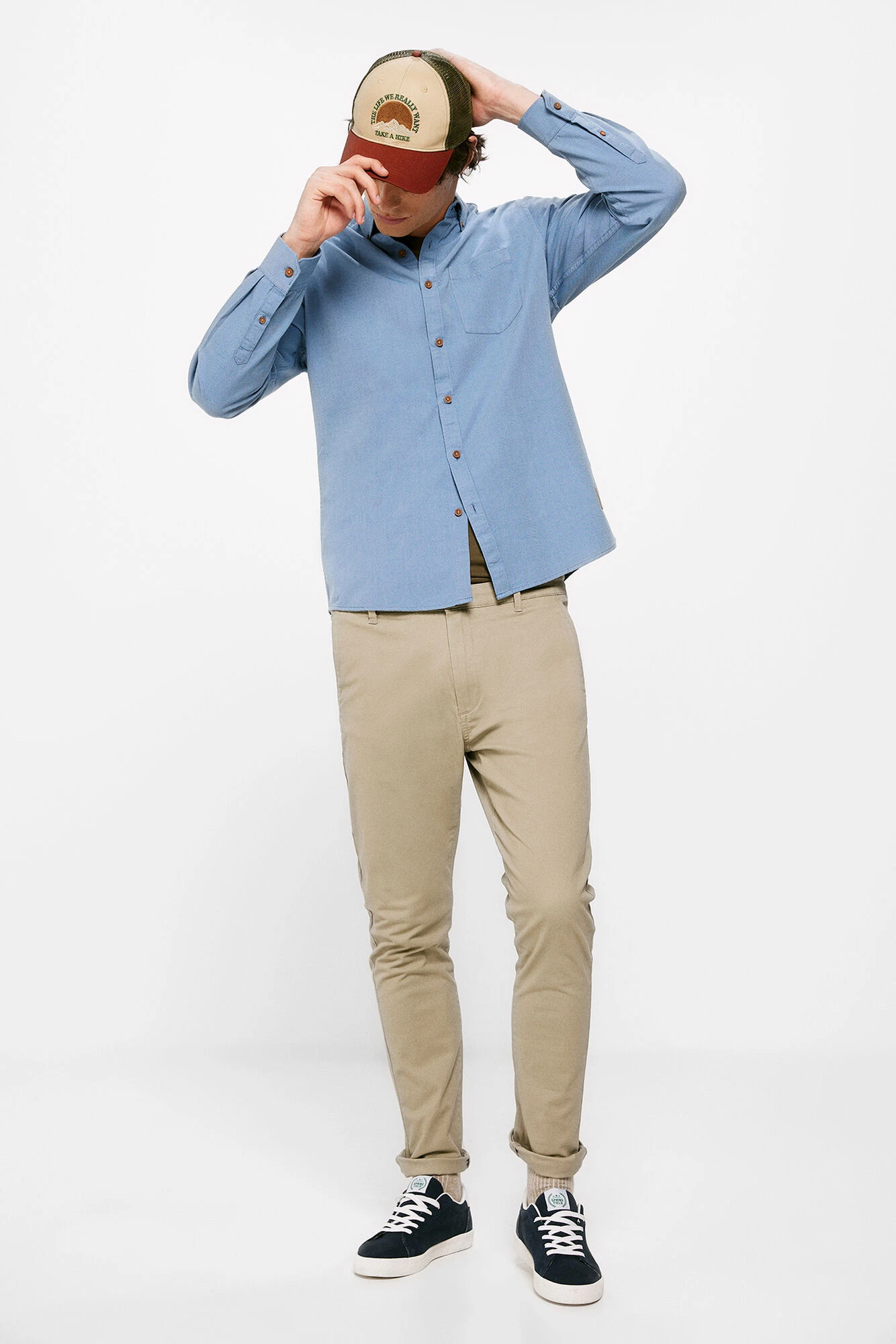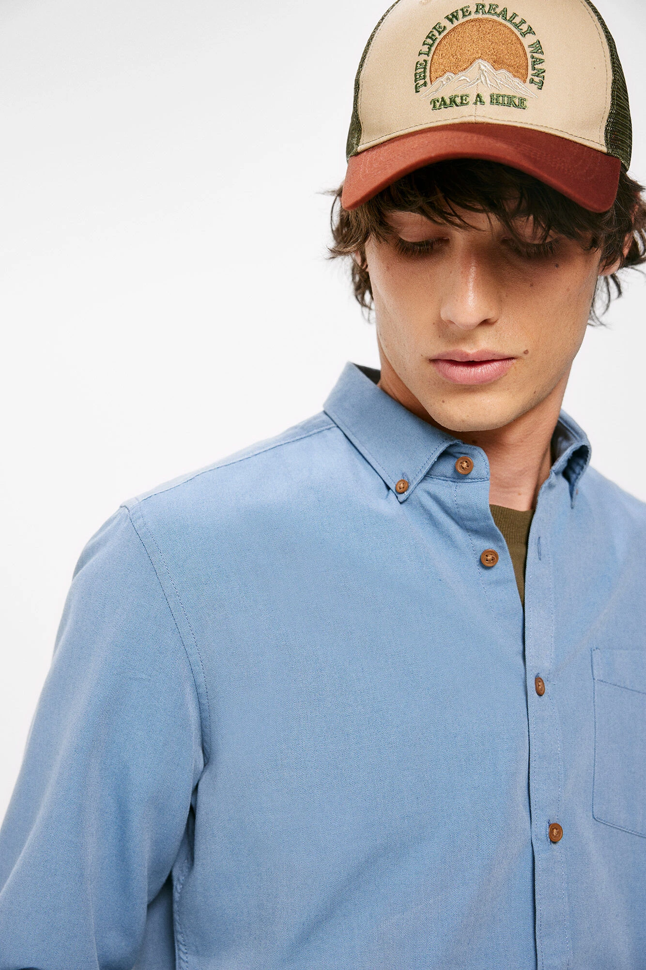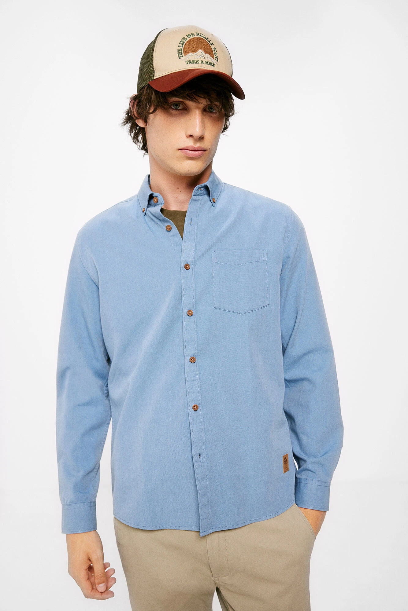 Camisa de manga larga custom fit, en tejido tipo oxford, en color indigo. Cuello abotonado. Un bolsillo en pecho.