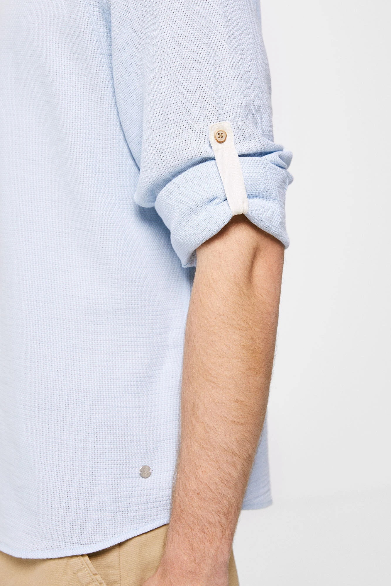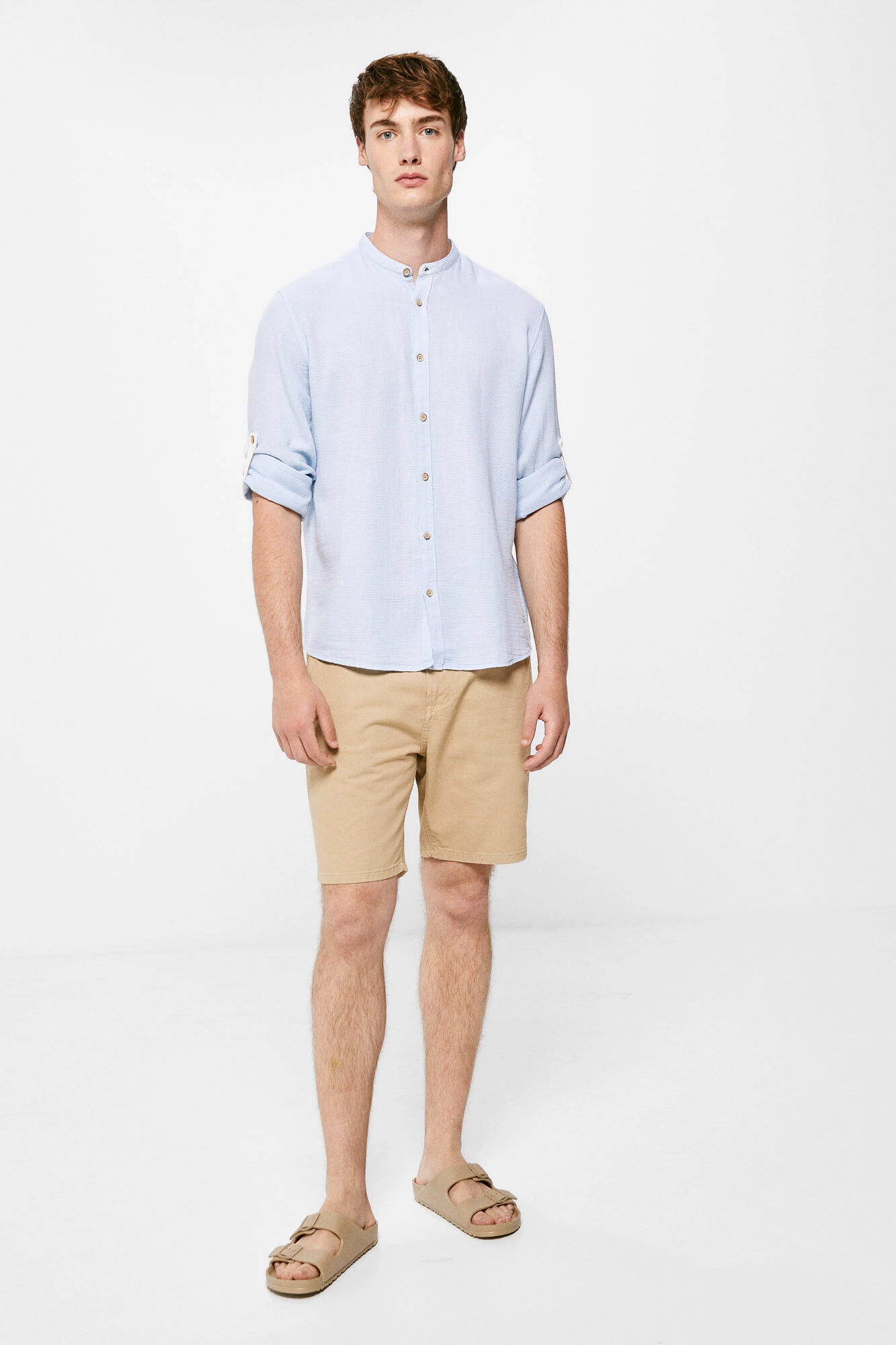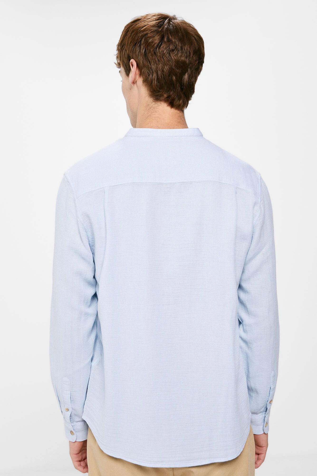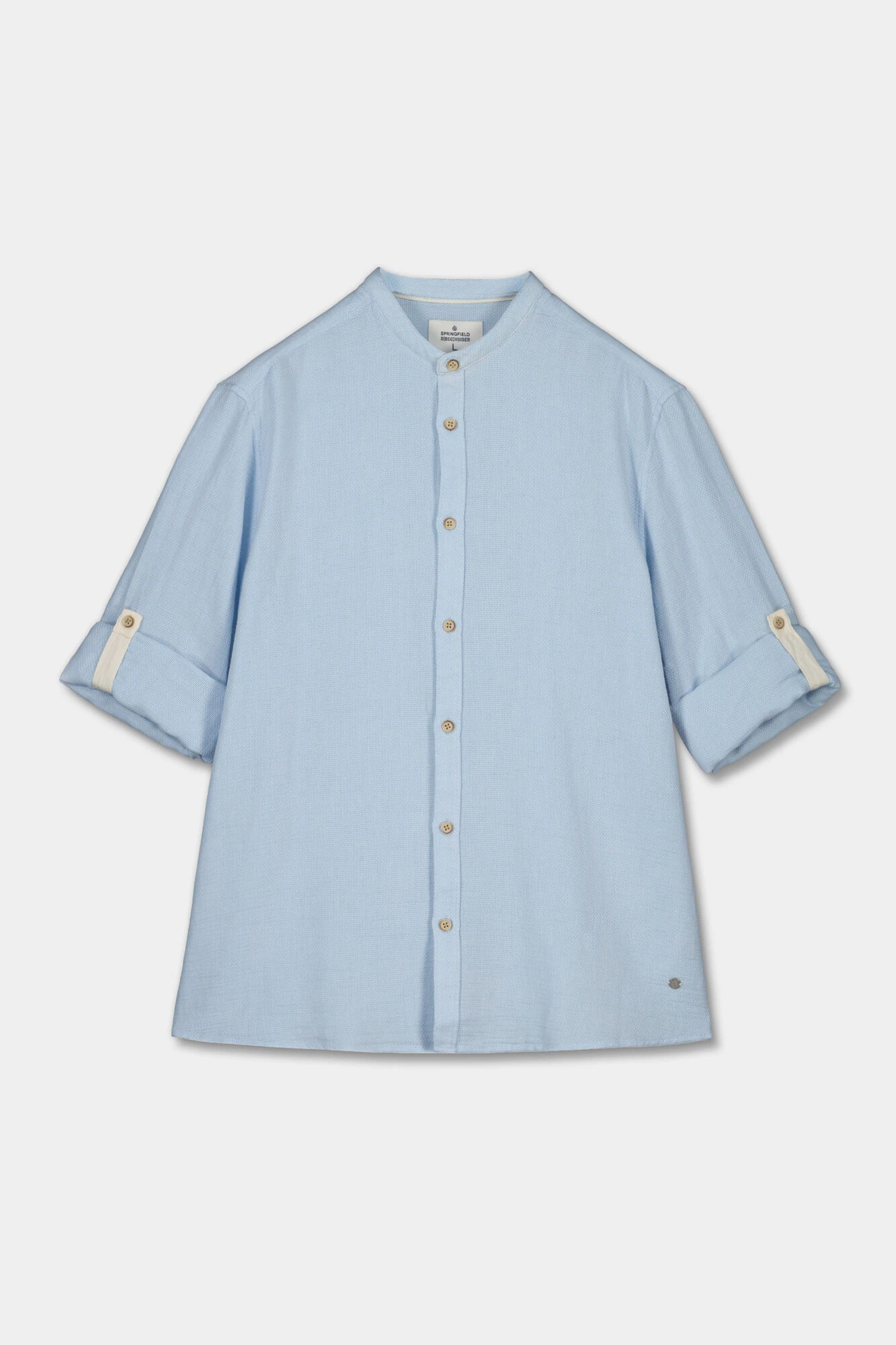 Camisa de manga larga, regular fit, en tejido tipo estructura en algodón. Cuello mao y mangas enrollables. Proyecto RECONSIDER.