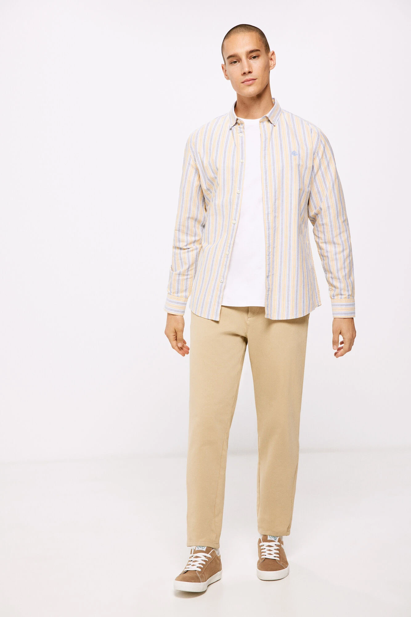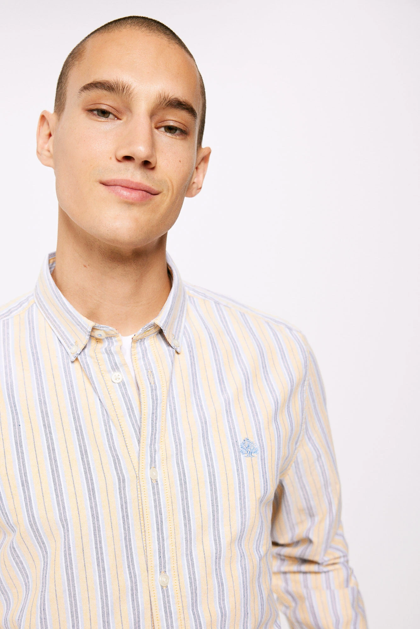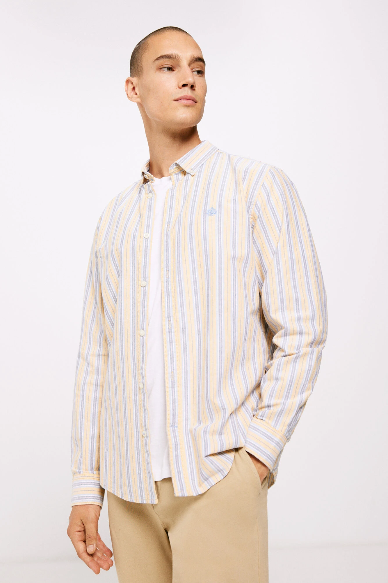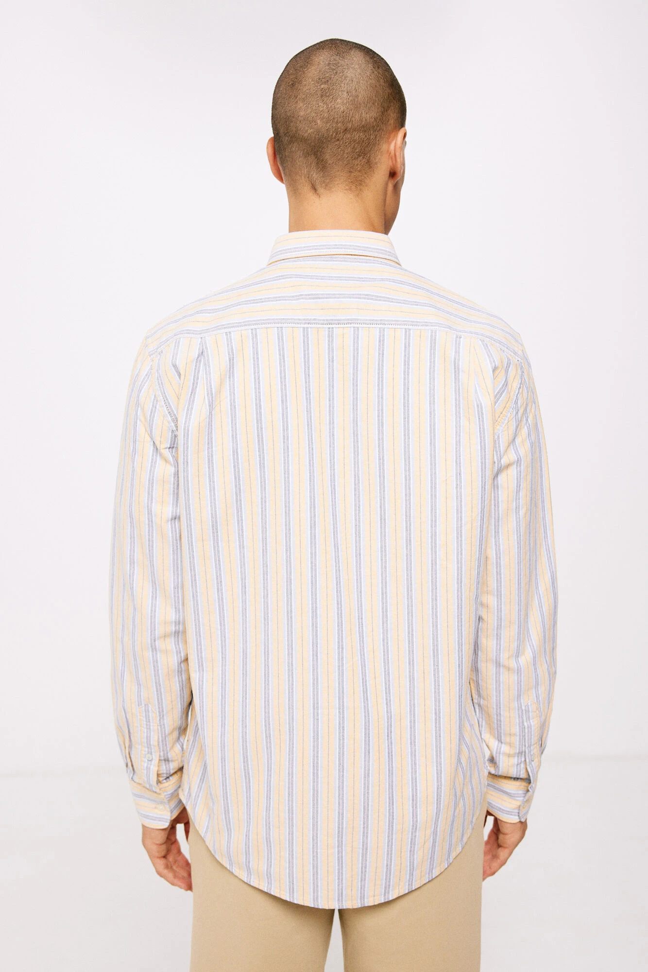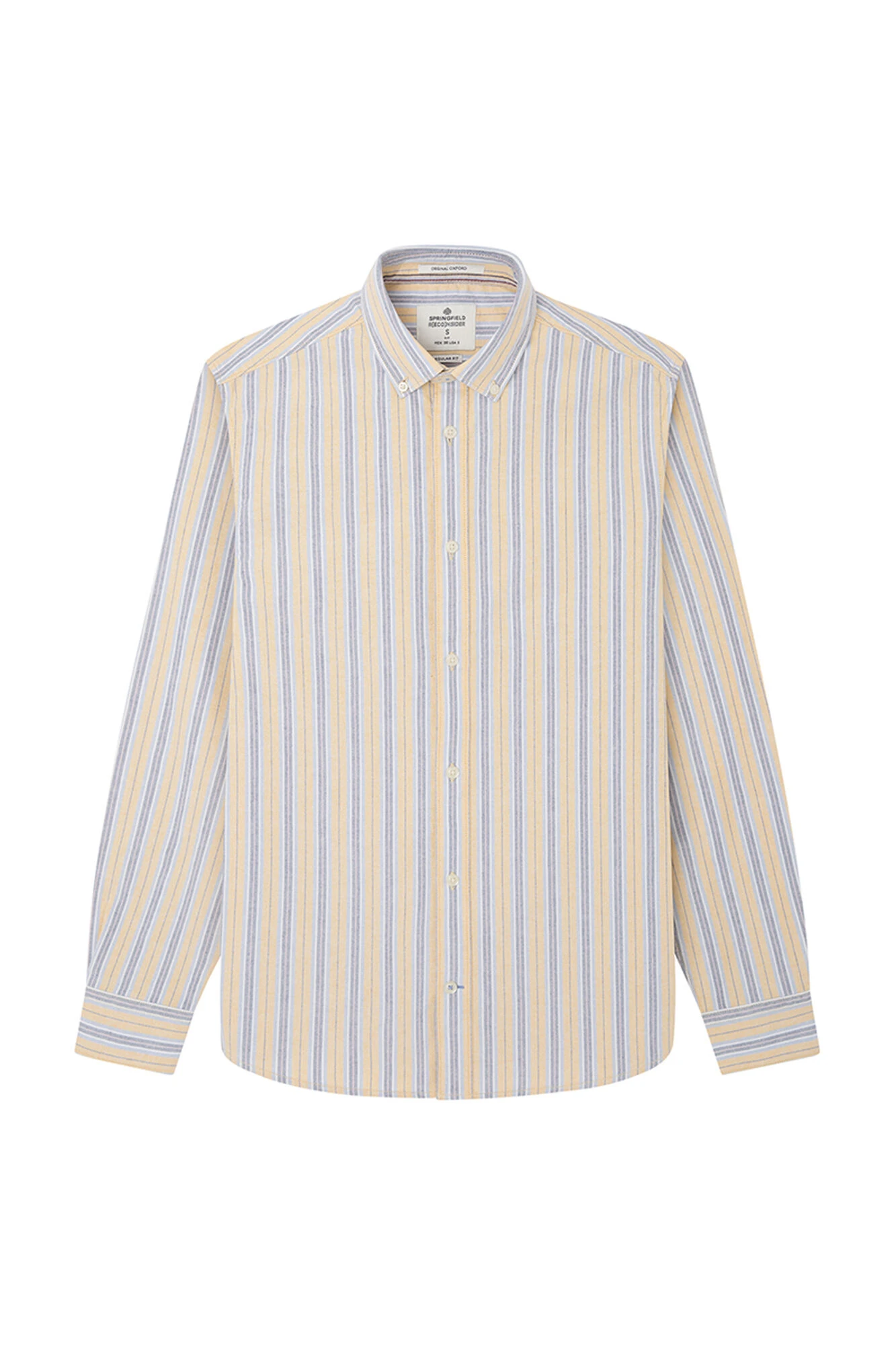 Camisa polera de manga larga, regular fit, en tejido de oxford de algodón de rayas multicolor. Cuello abotonado. Proyecto RECONSIDER.