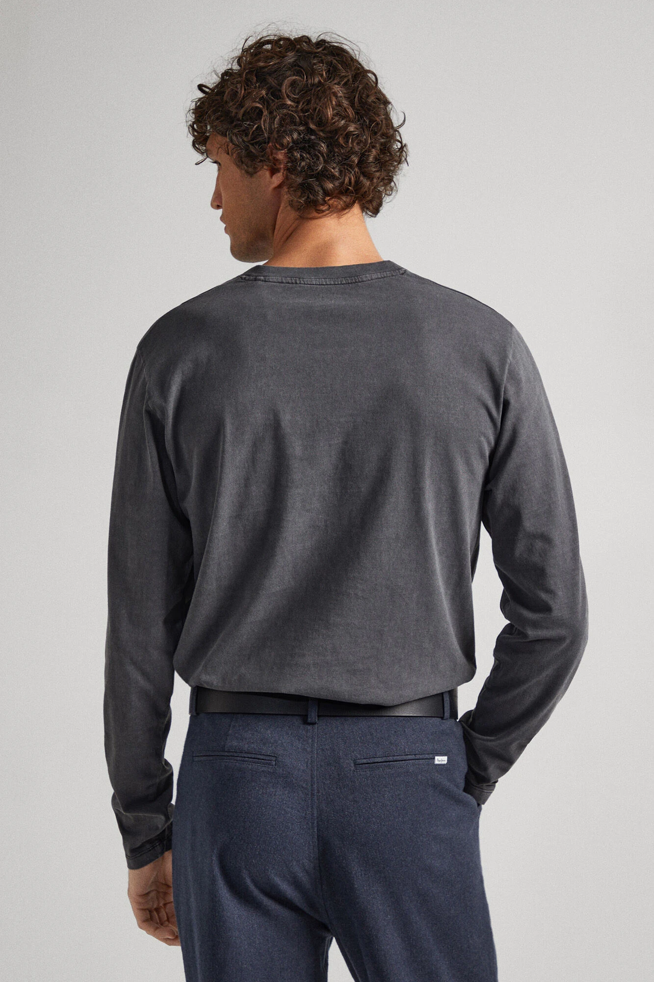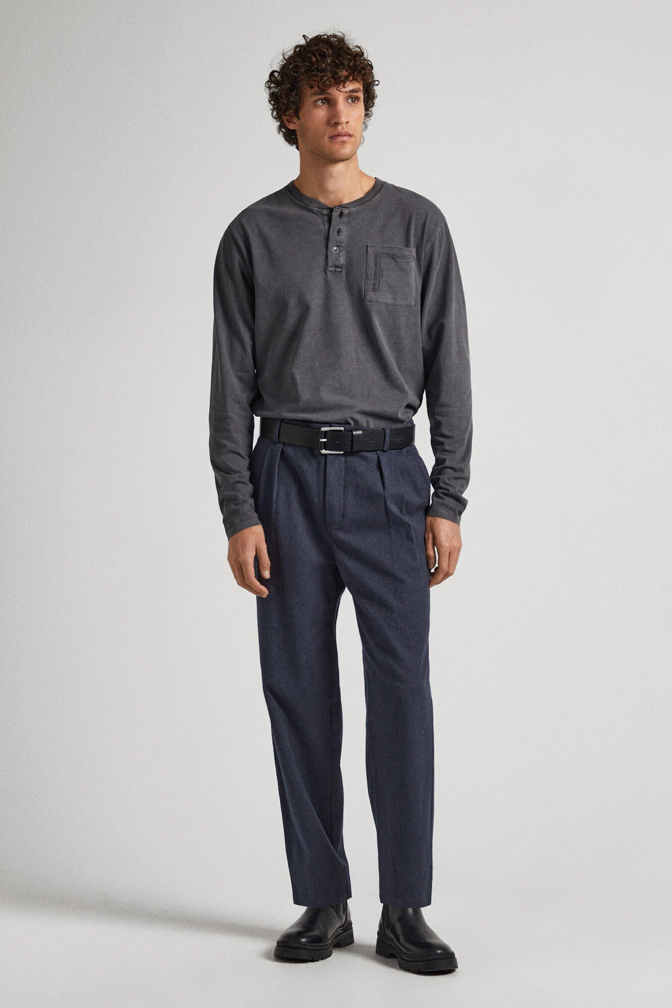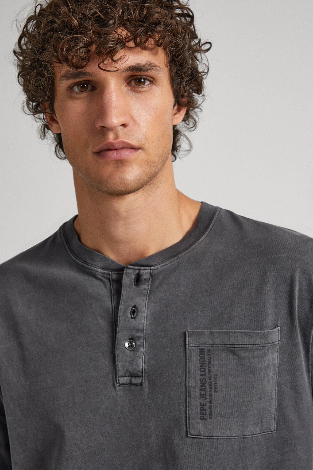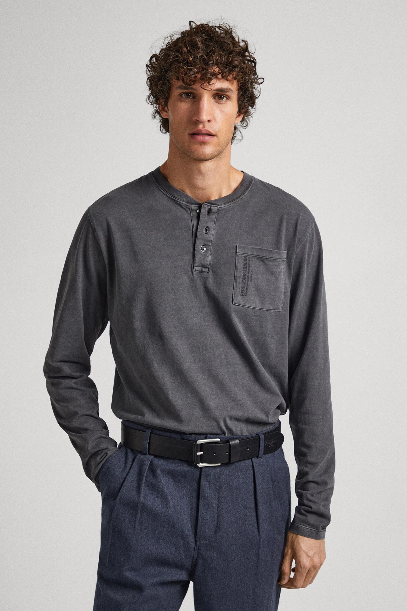 – Camiseta Portobello en tejido suave – Fit regular – Manga larga – Cuello panadero – Tapeta de tres botones – Bolsillo de parche con logo PEPEJEANS estampado e … n el pecho – Detalle canalé en el cuello – Acabado doble pespunte en bajo y mangas – Cinta con logo estampado al interior del cuello – Fabricada 100% en algodón sostenible