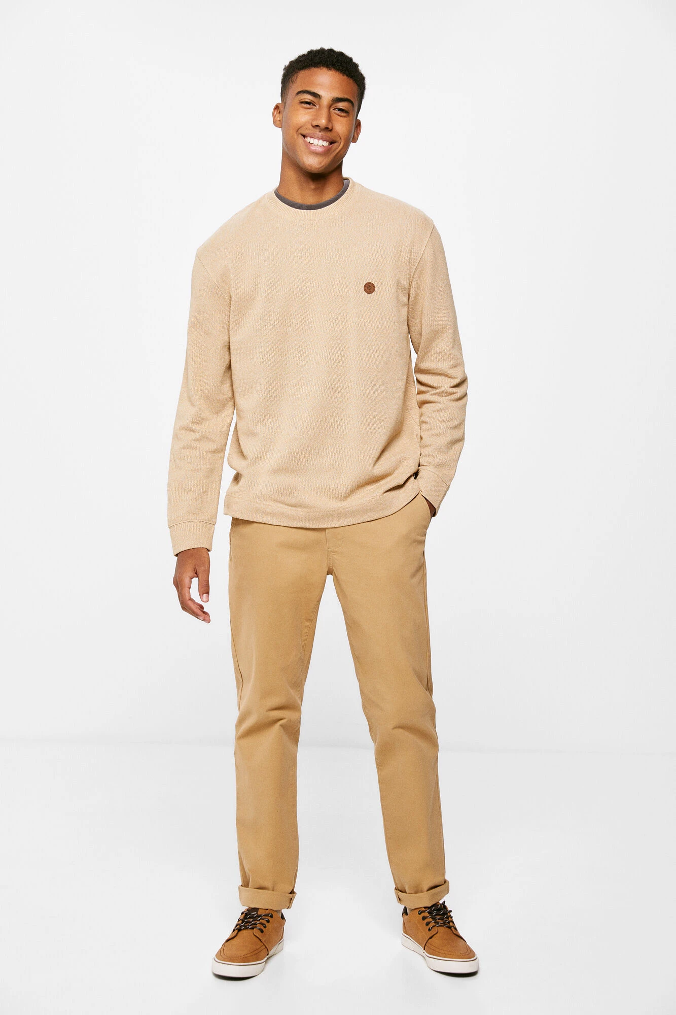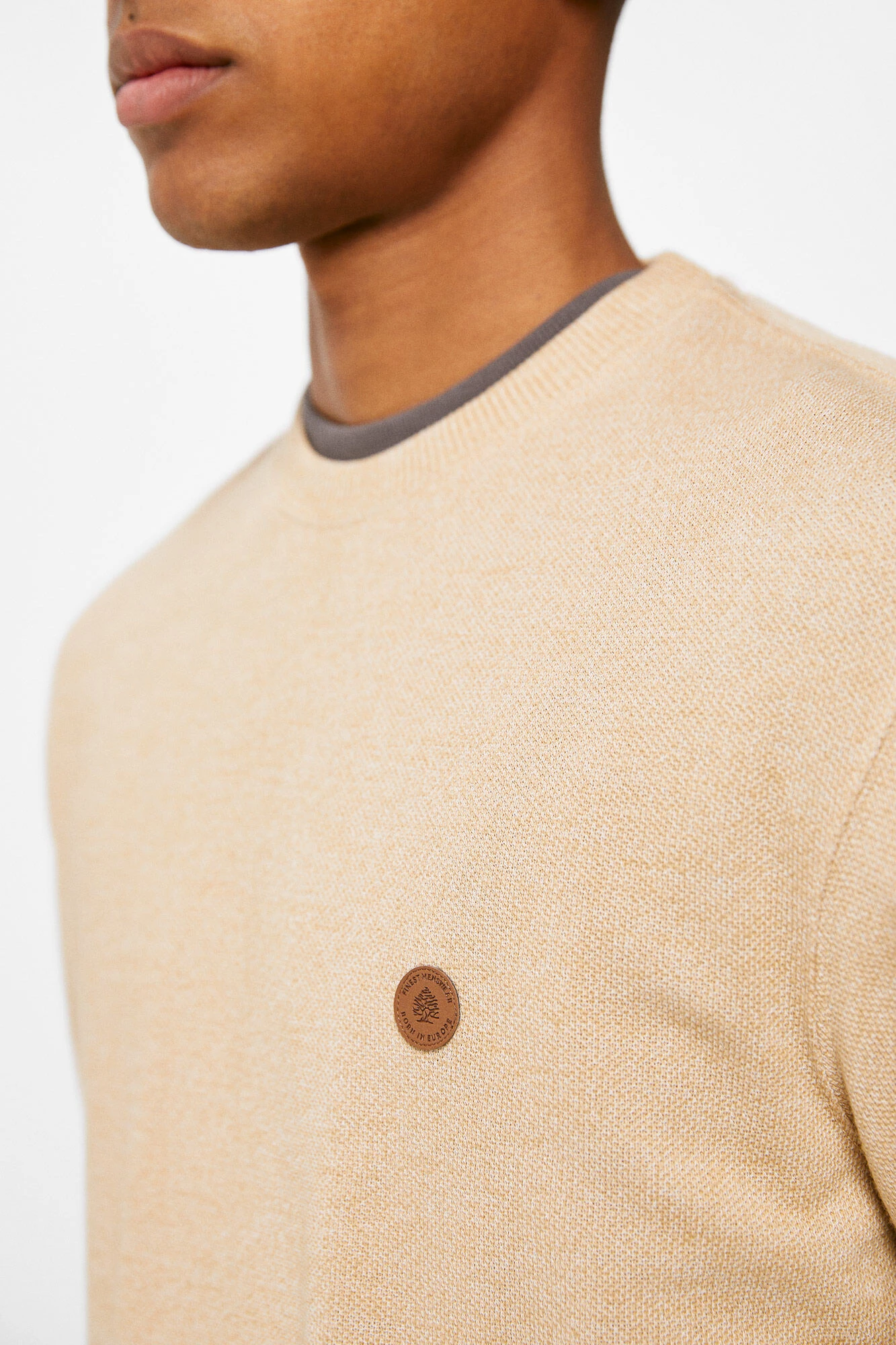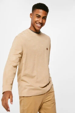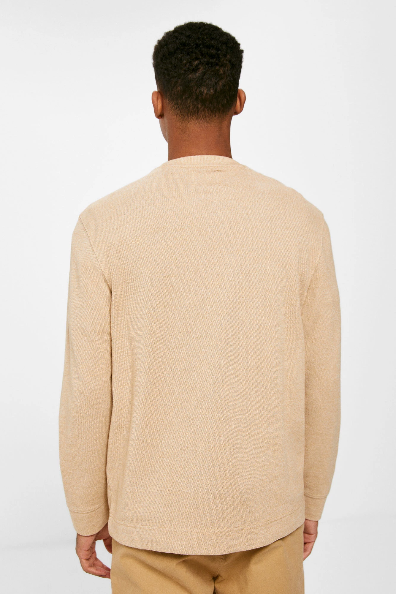 Camiseta de manga larga con tejido texturizado imitando un jersey. Etiqueta decorativa efecto piel en el pecho.