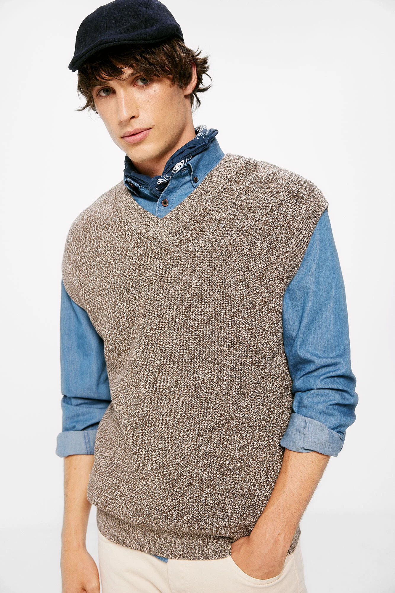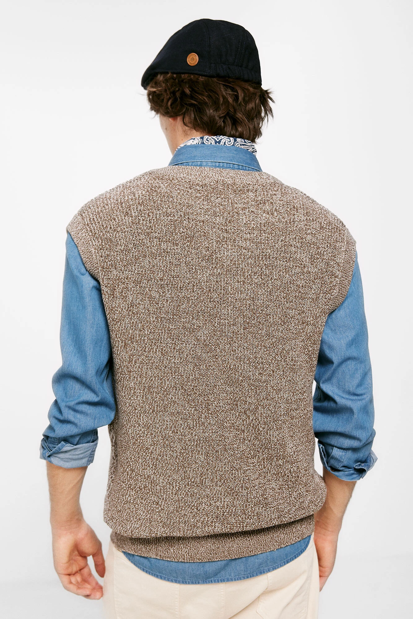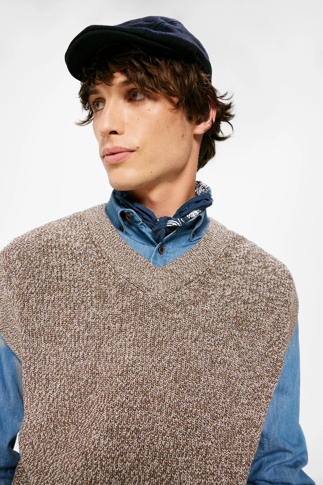 Chaleco estructura 100% algodón hilatura fantasia en cuello pico. Bajos en canalé .Proyecto RECONSIDER.