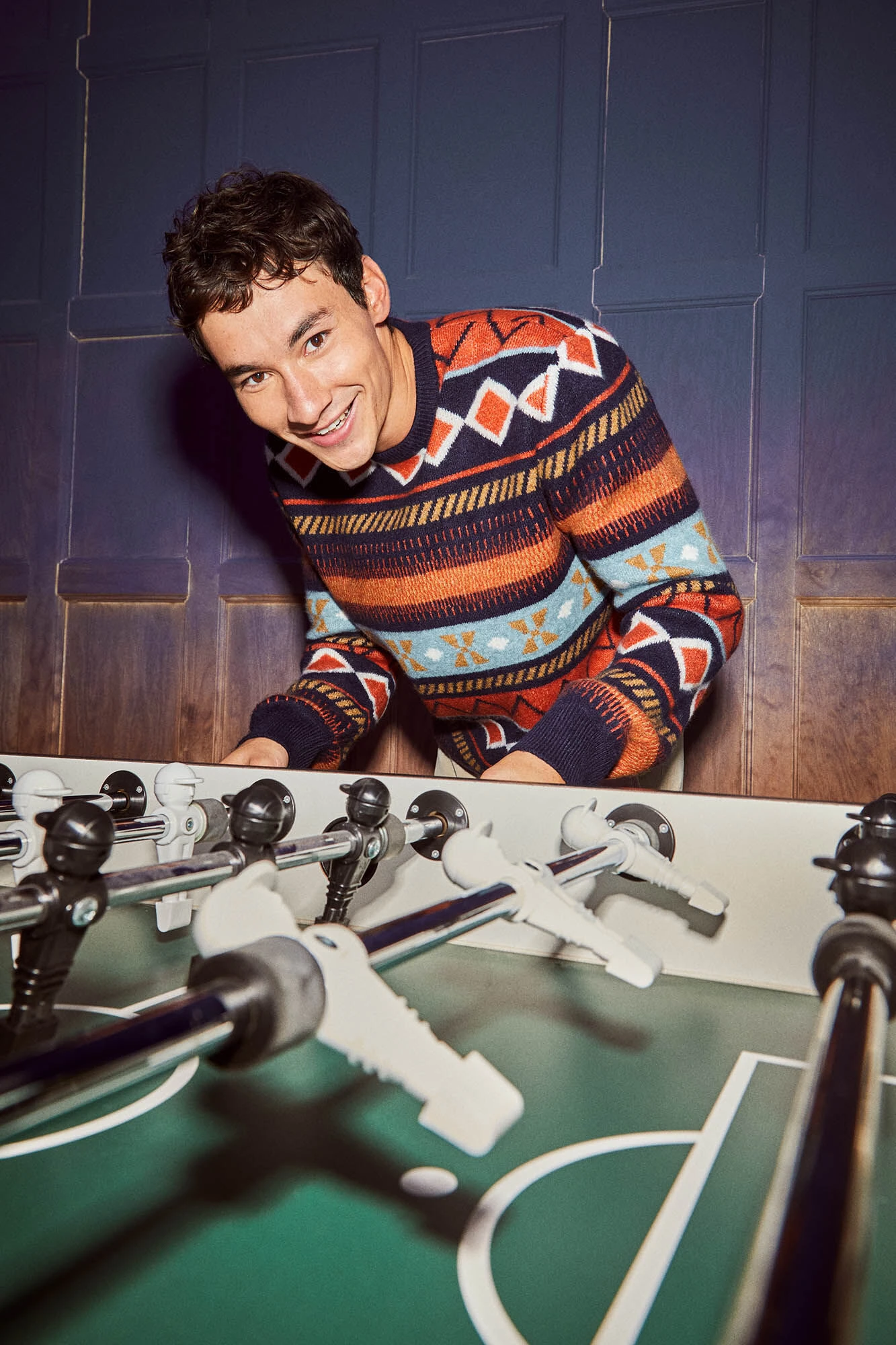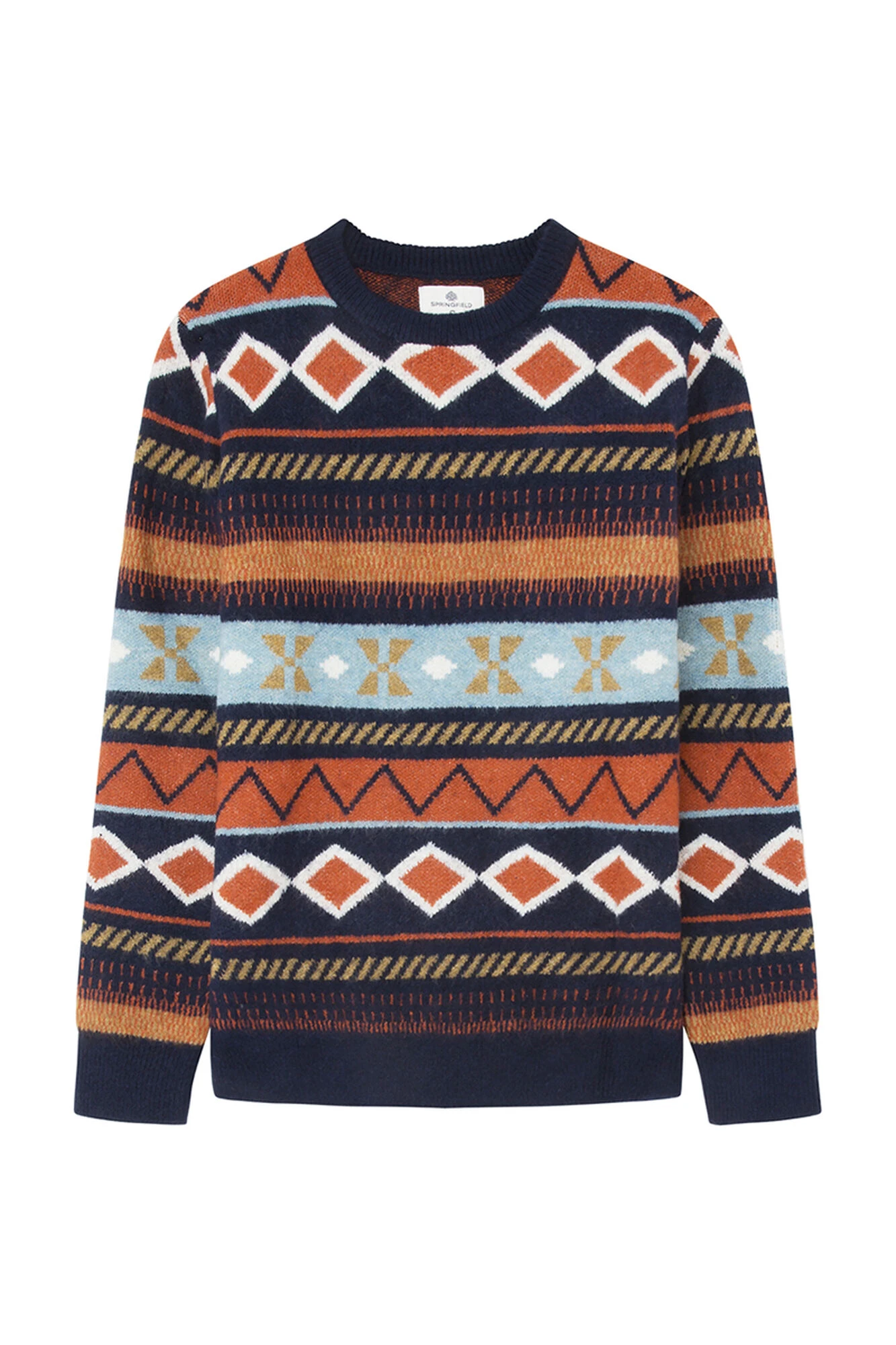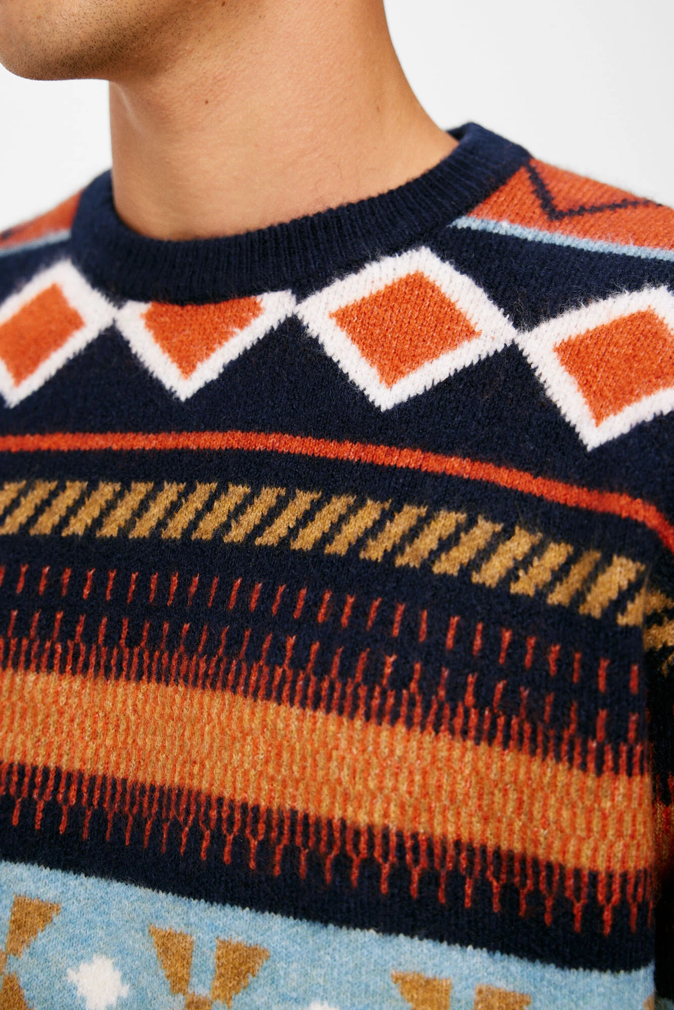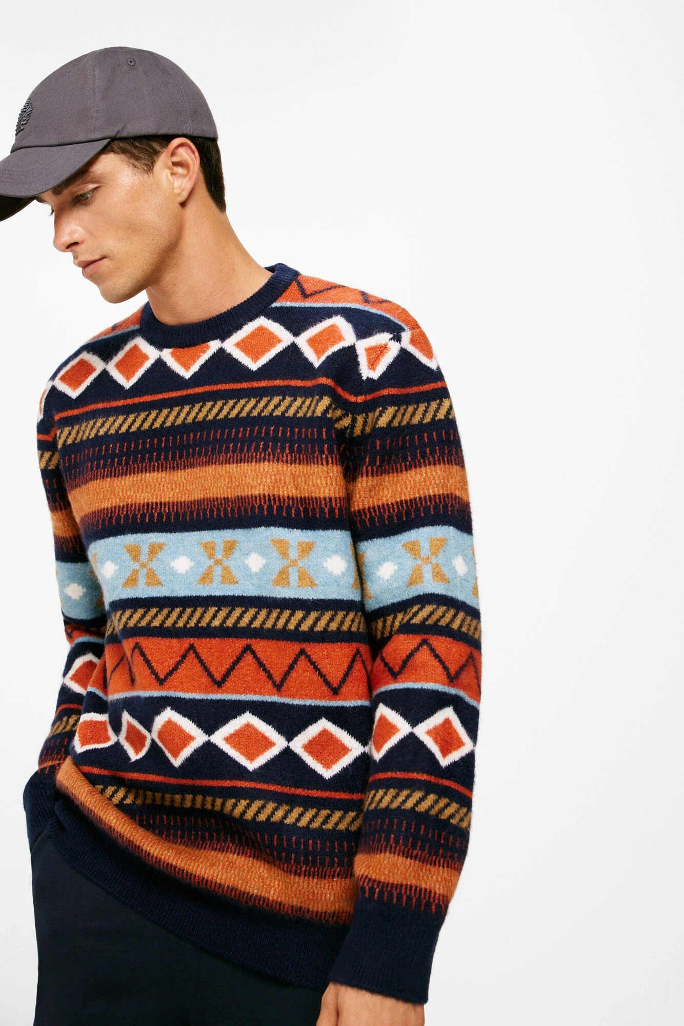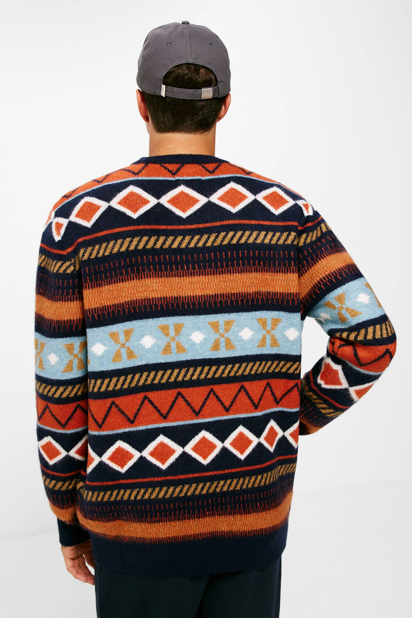 Jersey grueso jacquard hilatura fantasía . Cuello redondo . Bajos y puño en canalé.