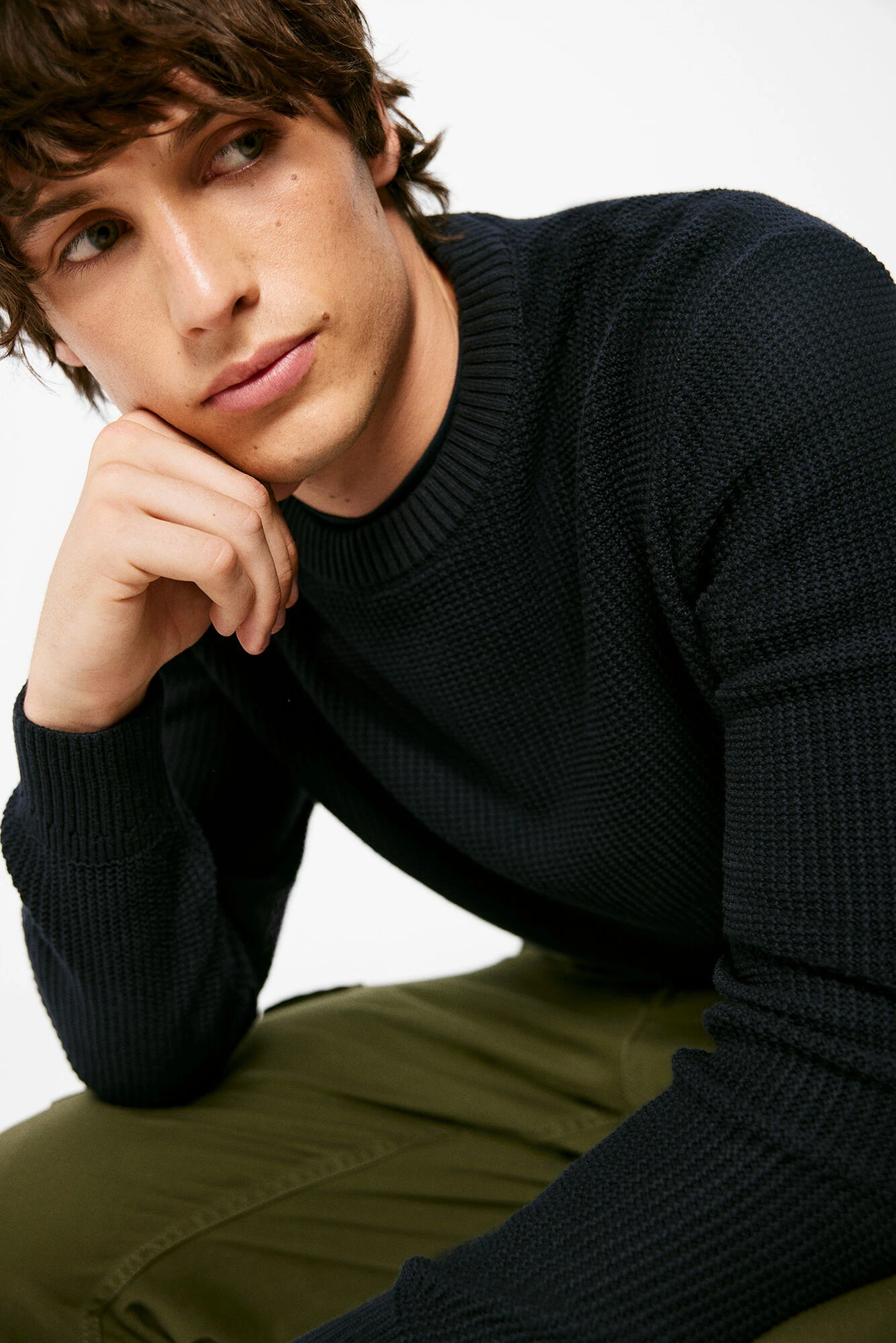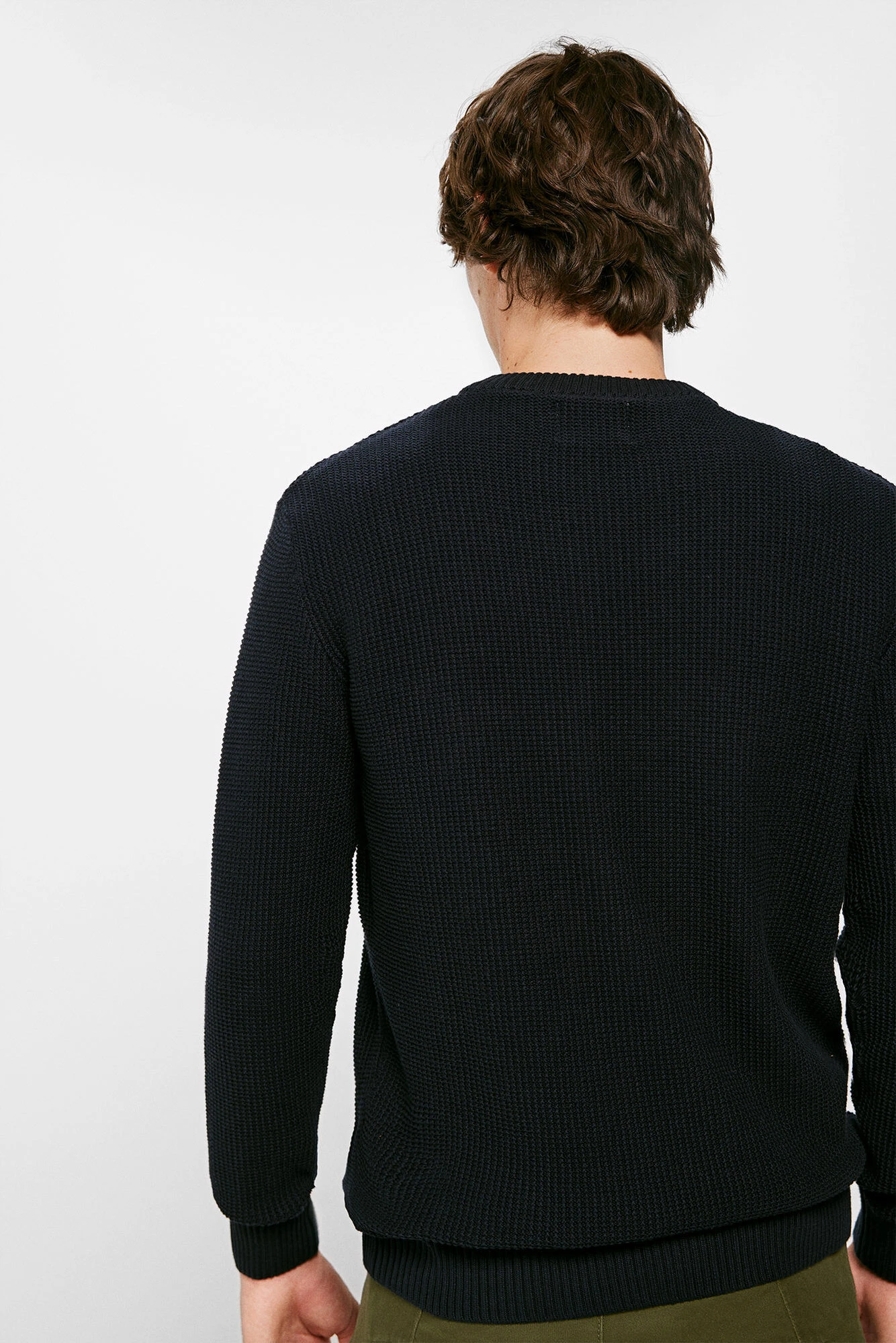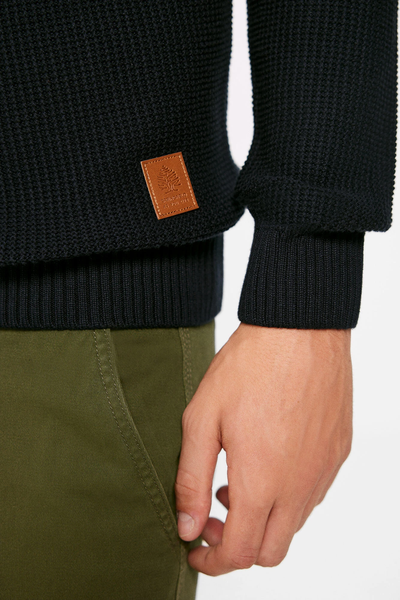 Jersey grueso cuello redondo en 100%algodón . Estructura fantasía. Puños y bajos en canalé. Etiqueta decorativa efecto piel.